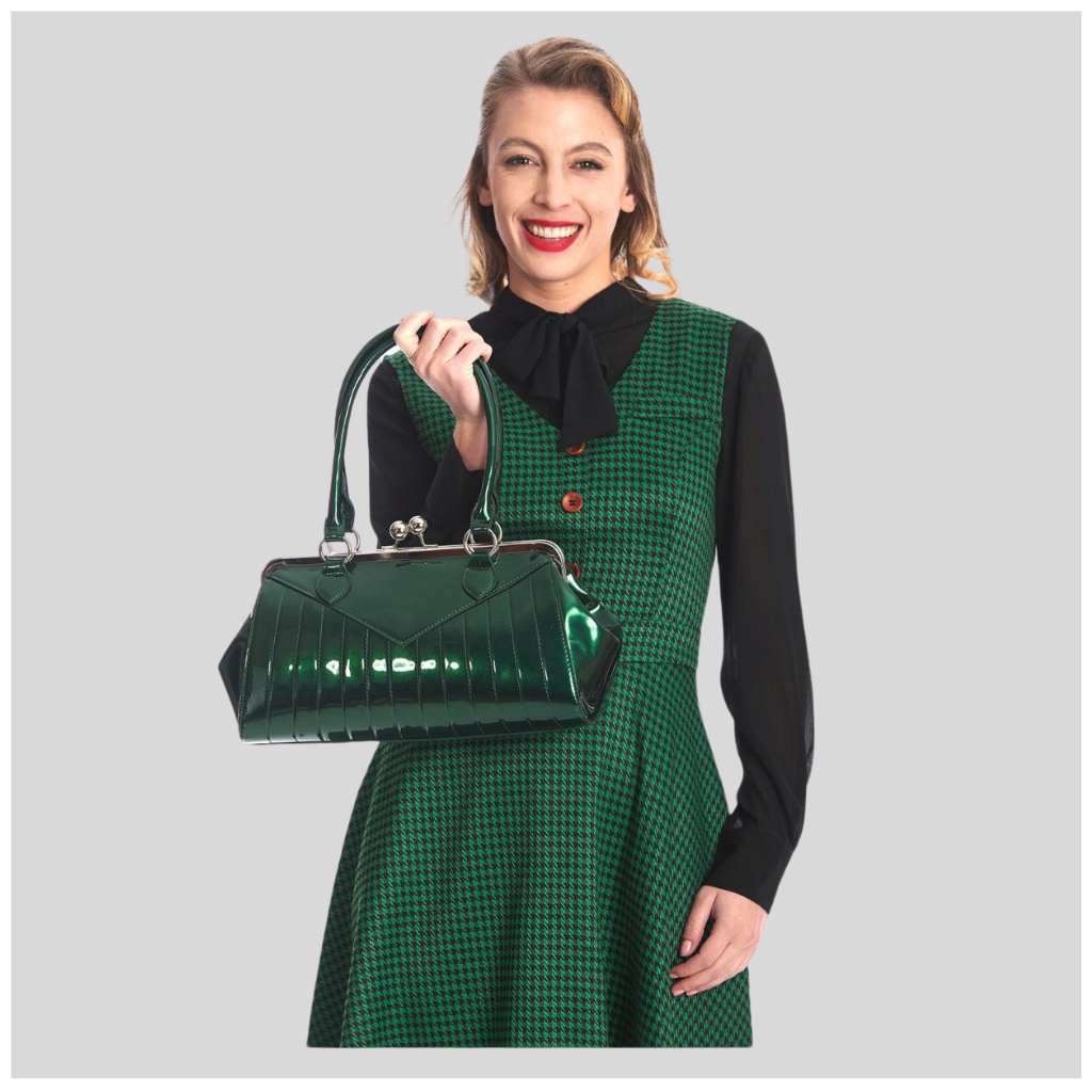 Add some retro flair to your wardrobe with this vintage-inspired handbag! Made of faux leather with a fun, shiny finish, this bag is perfect for adding some shimmer to any outfit.