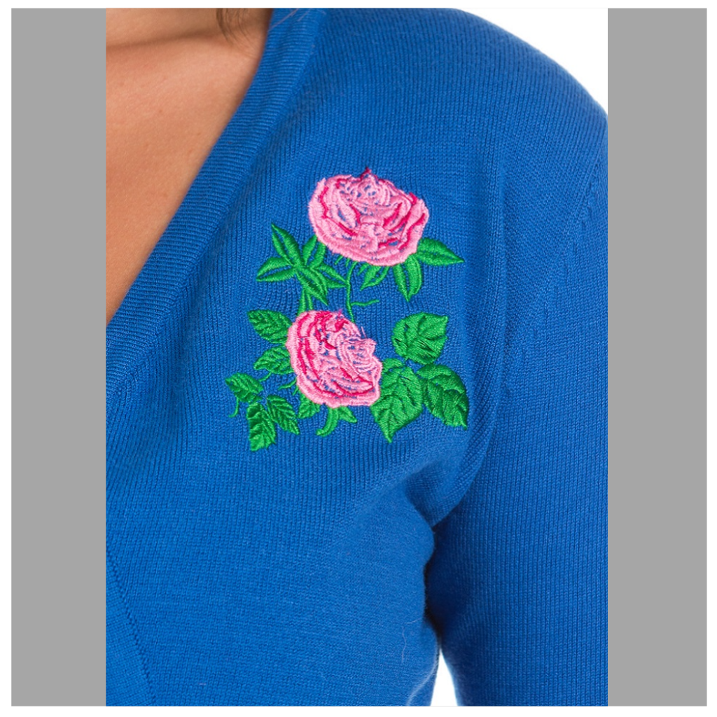 The design boasts a bejewelled rose in pink embroidered onto the chest of this beautiful shrug: a luxurious accompaniment to your favourite dress. The fabric is luxuriously soft, making it a delightful addition to any of our knitwear collections.