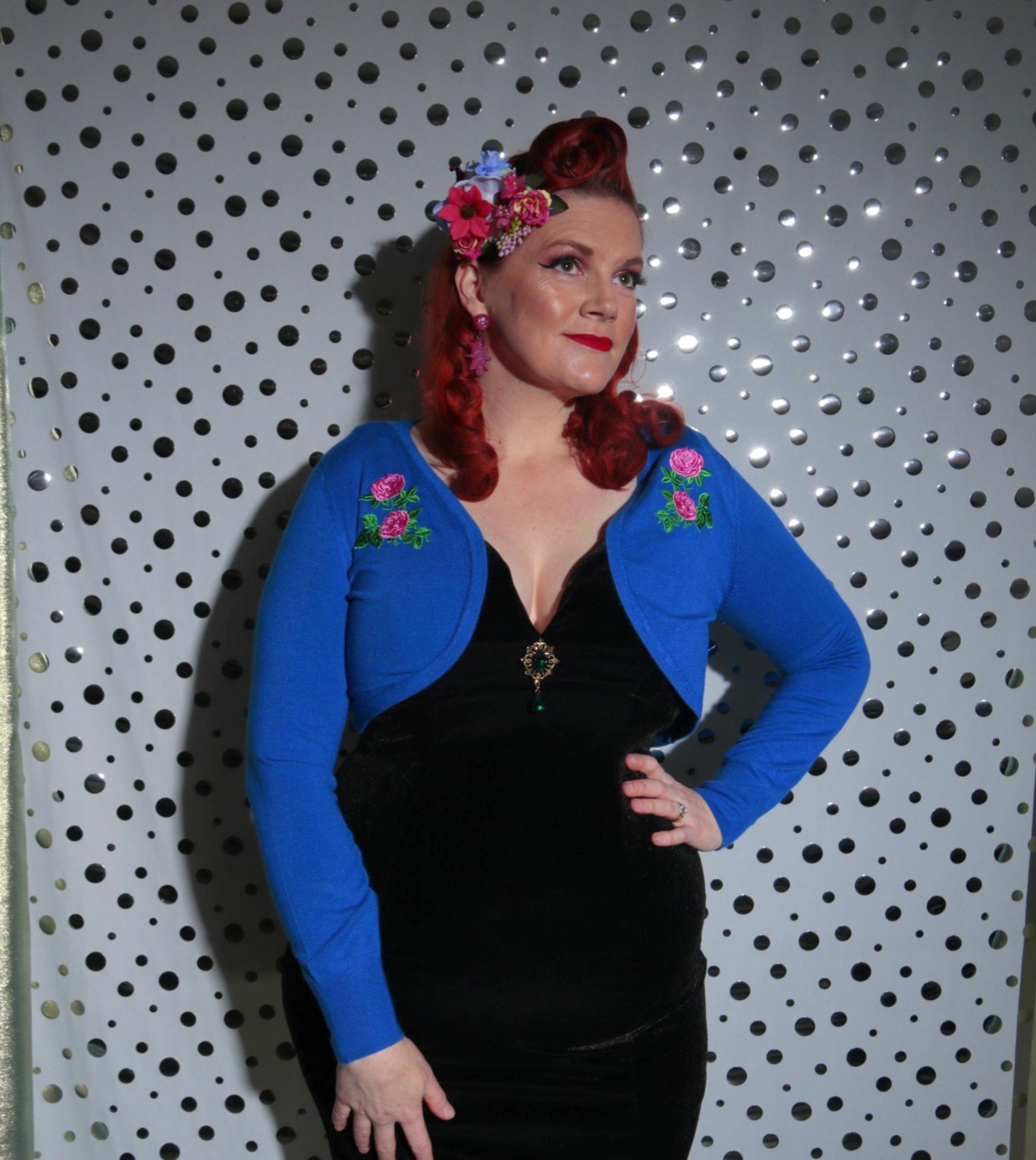 Centifolia Rose Retro Style Knitted Shrug/Bolero in Blue