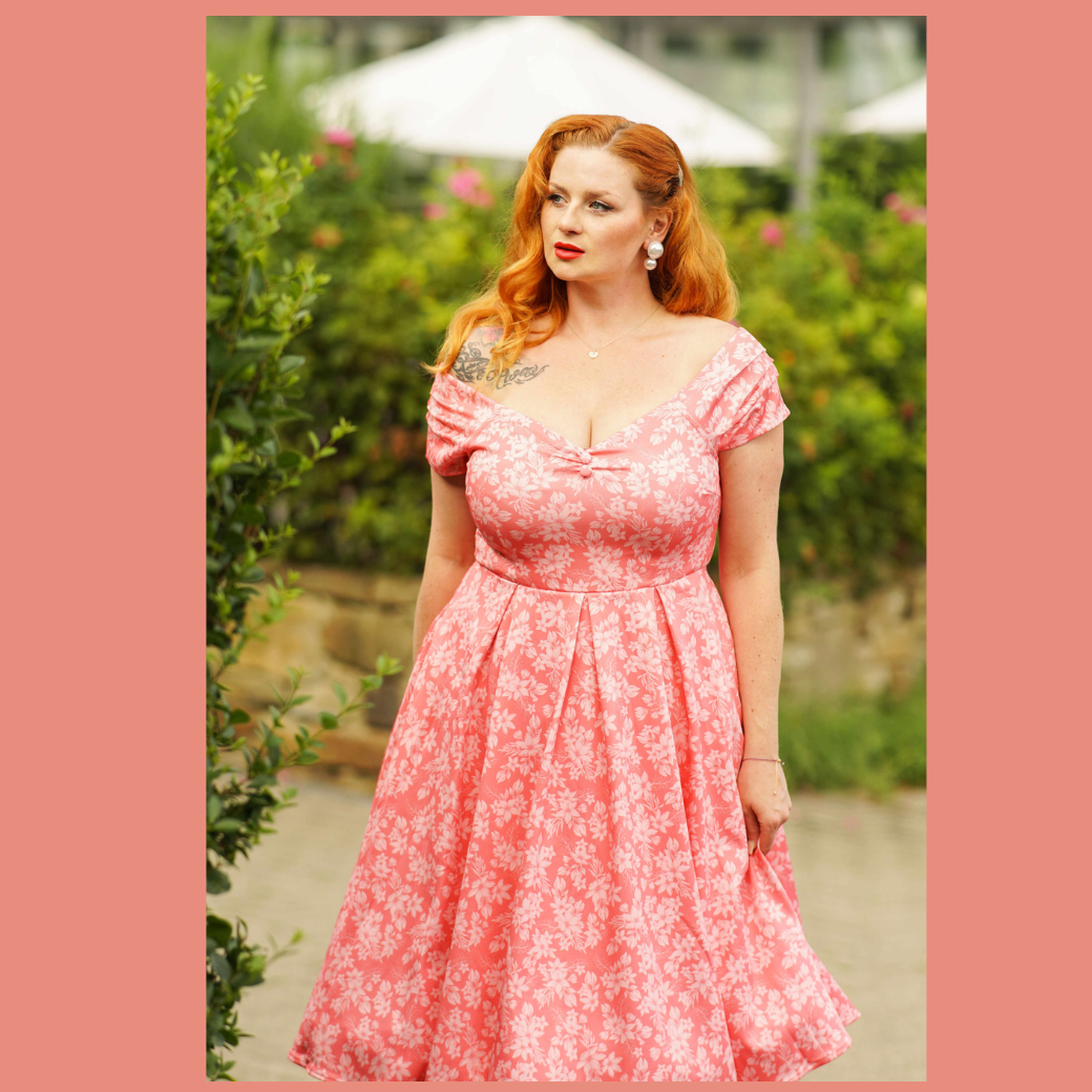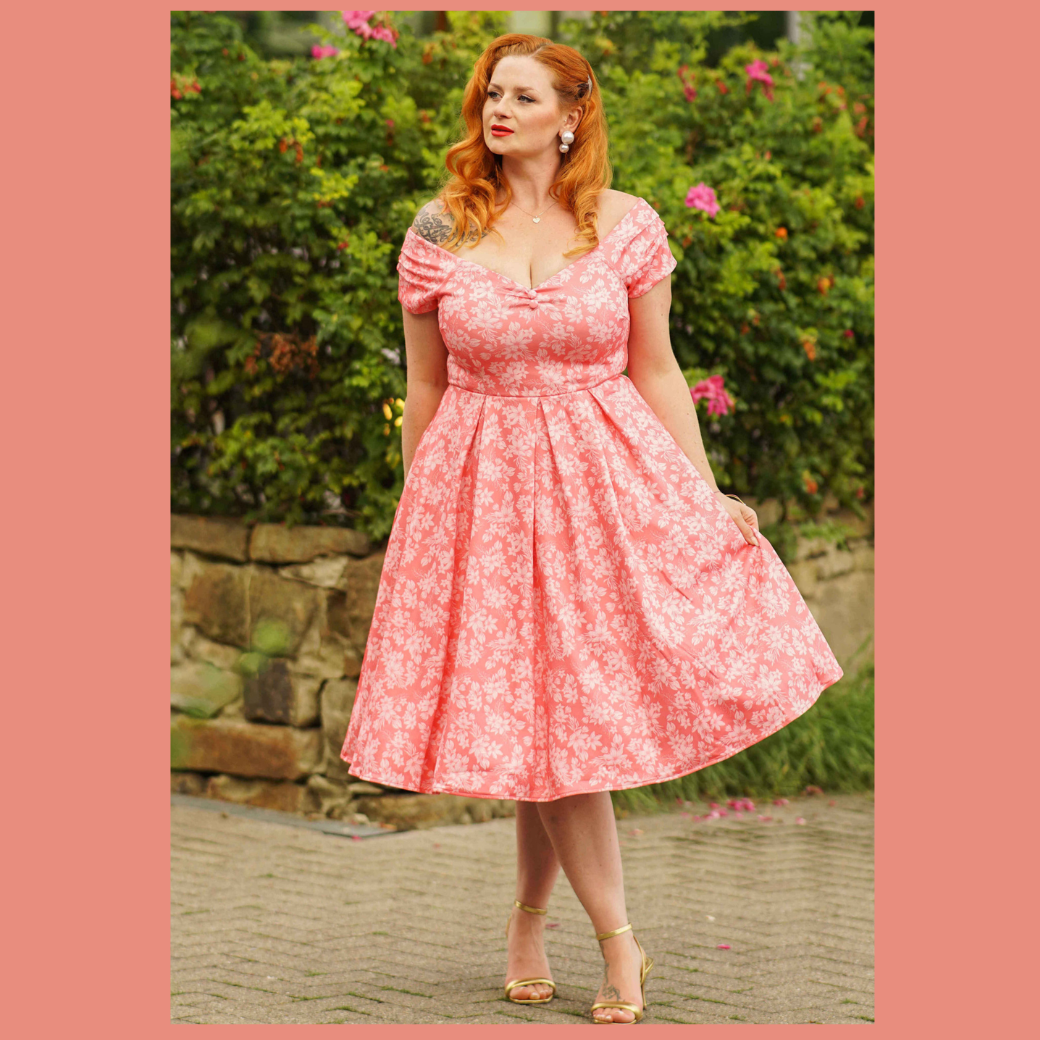 Lily off the Shoulder Pink Floral 50s Swing Dress