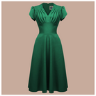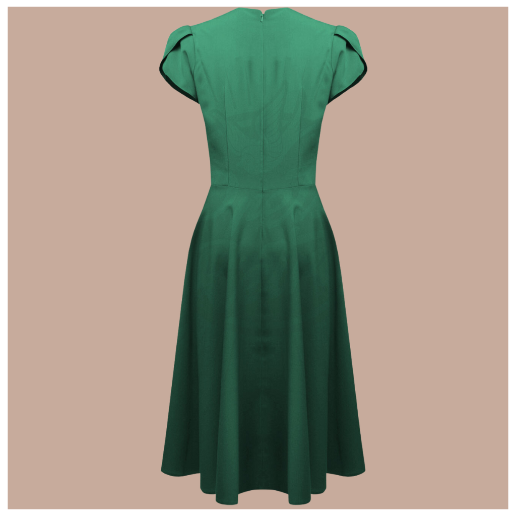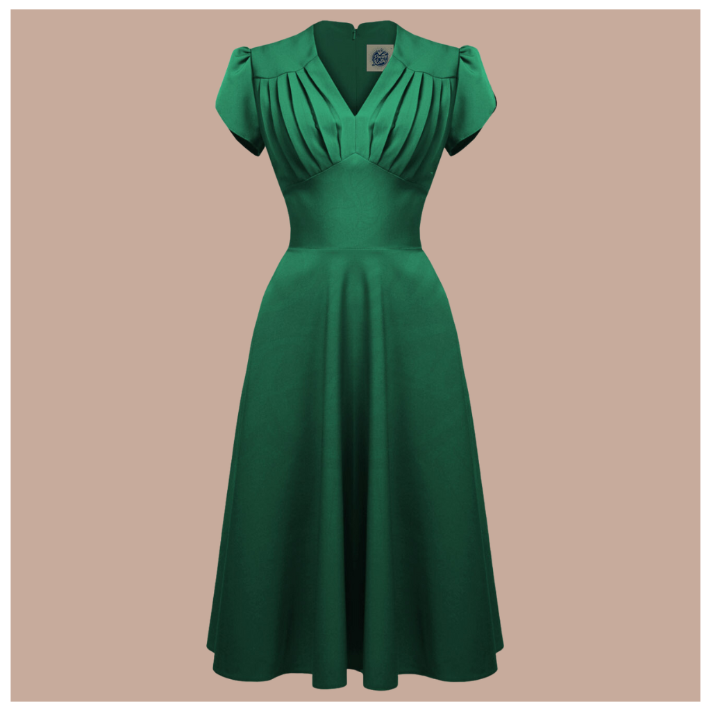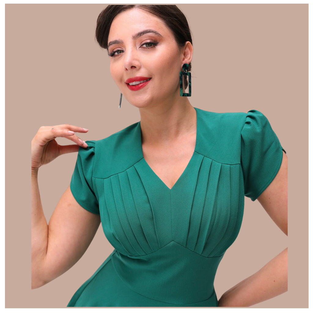 The fit on this dress creates a classic vintage 40s/50s silhouette. Pleated above and below bust emphasises ones assets and waist panel creates a further 'nipped in' look.