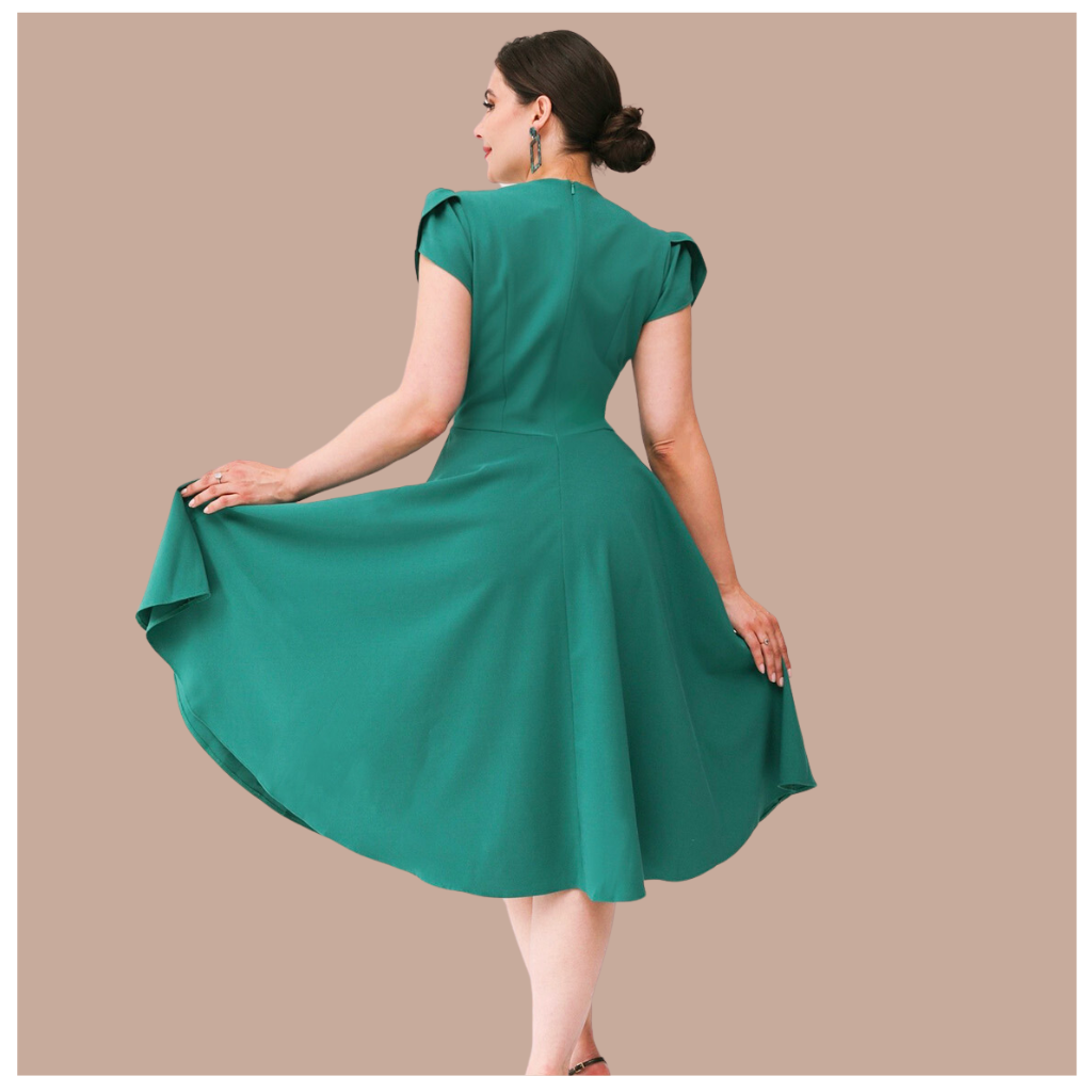 The 3 quarter full skirt gives a full sweep and petal cap sleeves mean this dress does not restrict arms.