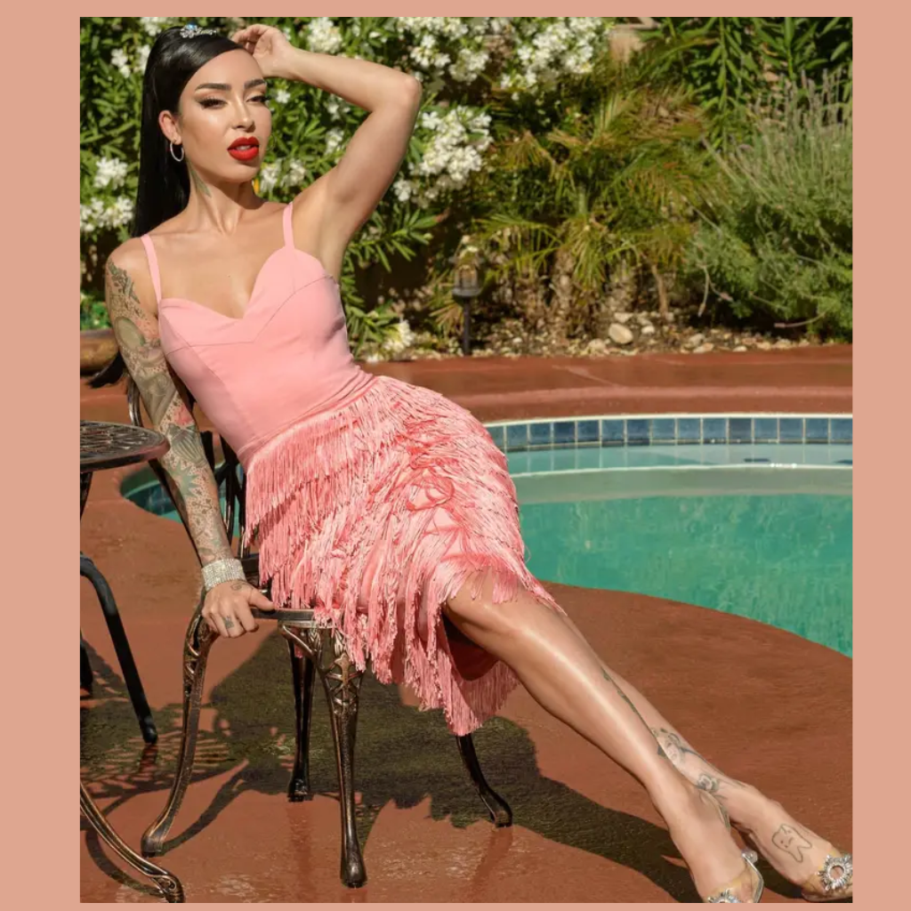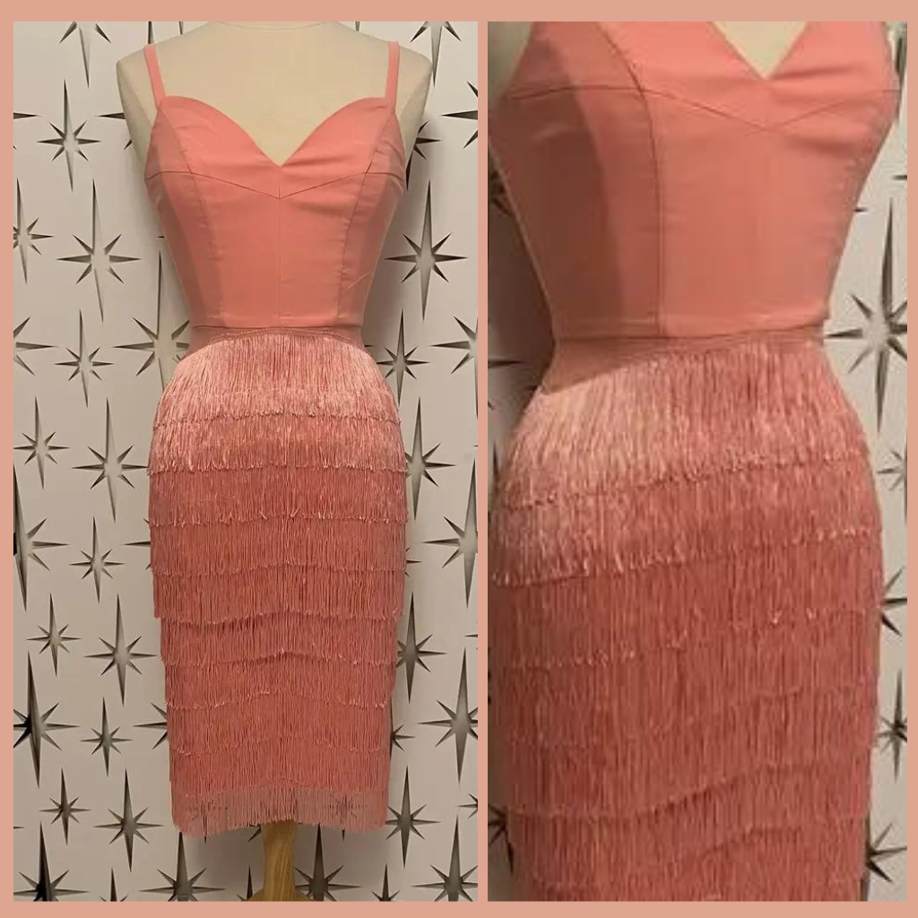 Shimmy and Shake, the Some Like it Hot dress is 1950s Fringe perfection! made of a structured curve hugging stretch bengaline fabric, with a perfect sweetheart bust featuring vintage style seaming, and a generously layered fringe pencil skirt, this dress is the ultimate combination of comfort and glam!
