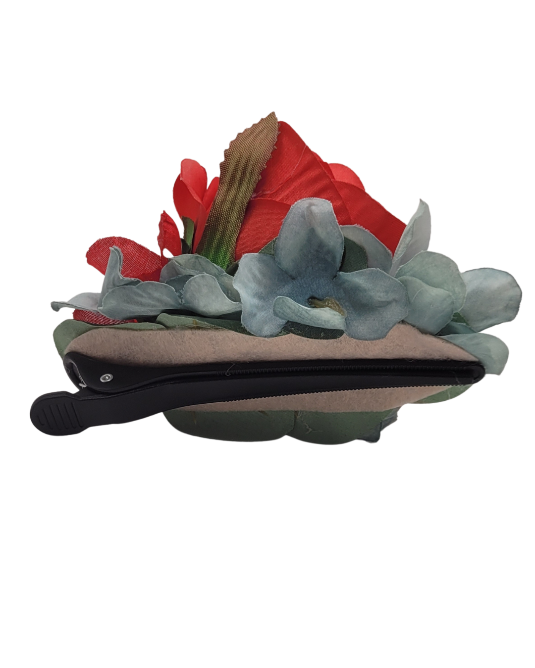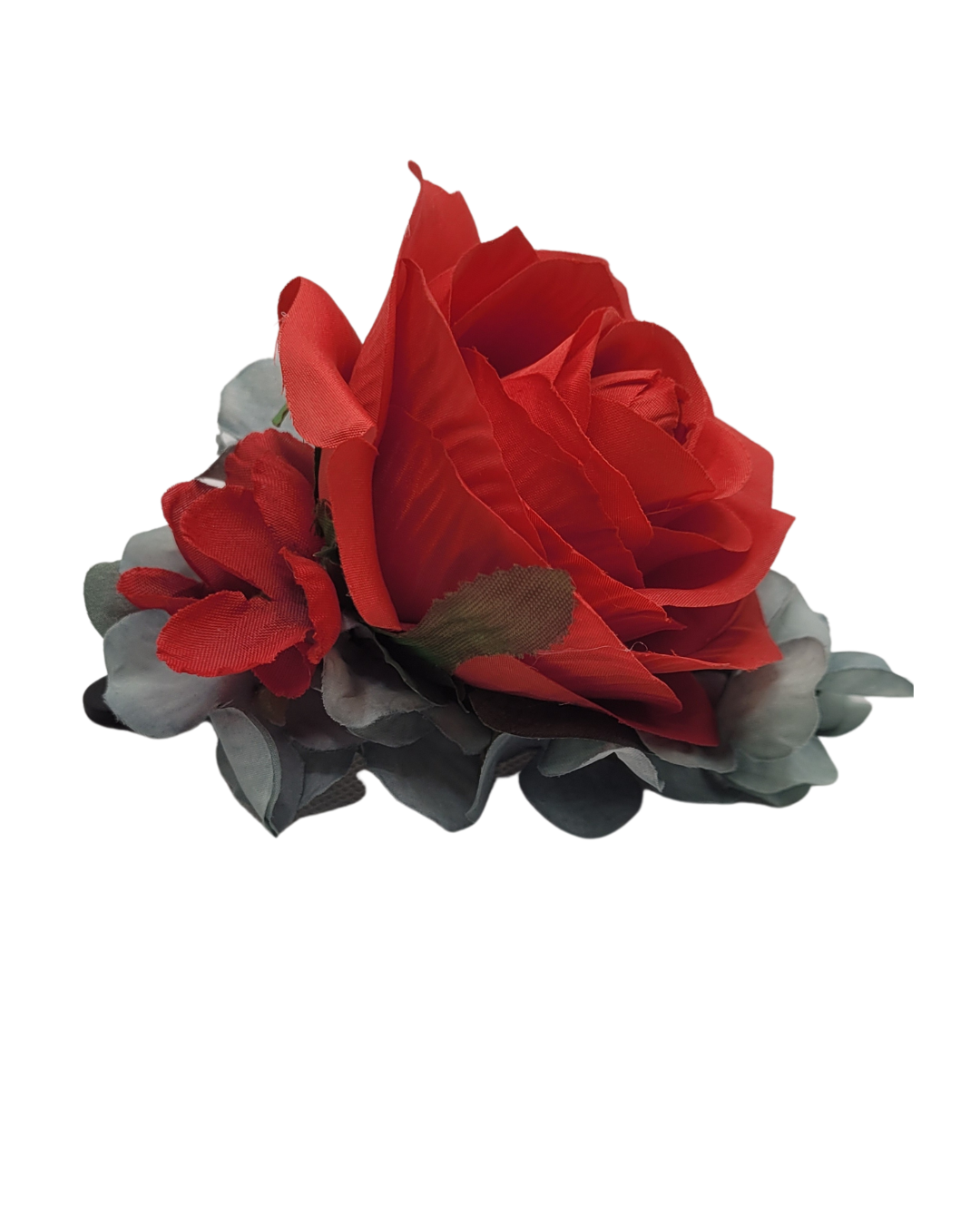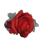 So pretty! one big red rose with a light blue flower. This is on a clip so it is easily placed in your hair.