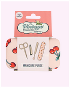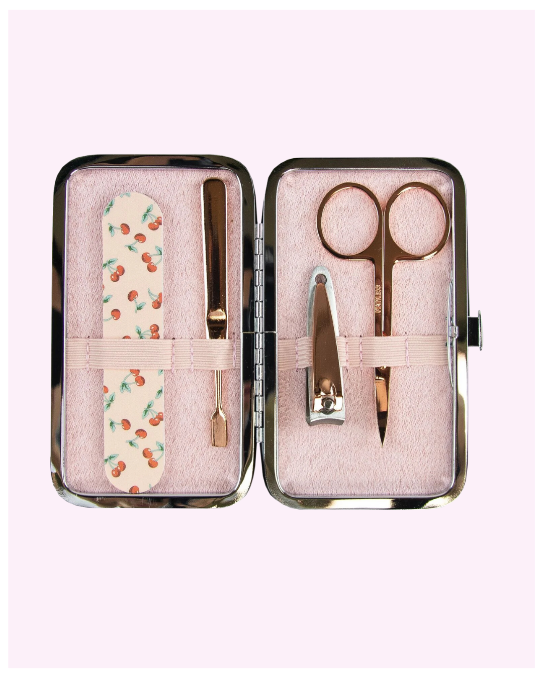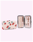 This luxurious sweet cherry Manicure Purse will allow you to clip, snip, push and smooth your way to beautifully groomed fingernails. Keep on your dressing table or pop it in your handbag for any nail emergencies on the go. The set includes a cherry print Emery Board and rose gold Scissors, Fingernail Clippers and Cuticle Pusher.