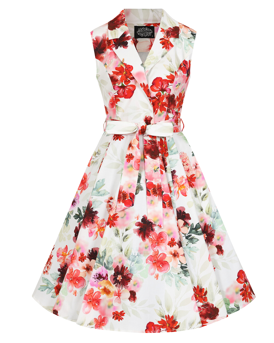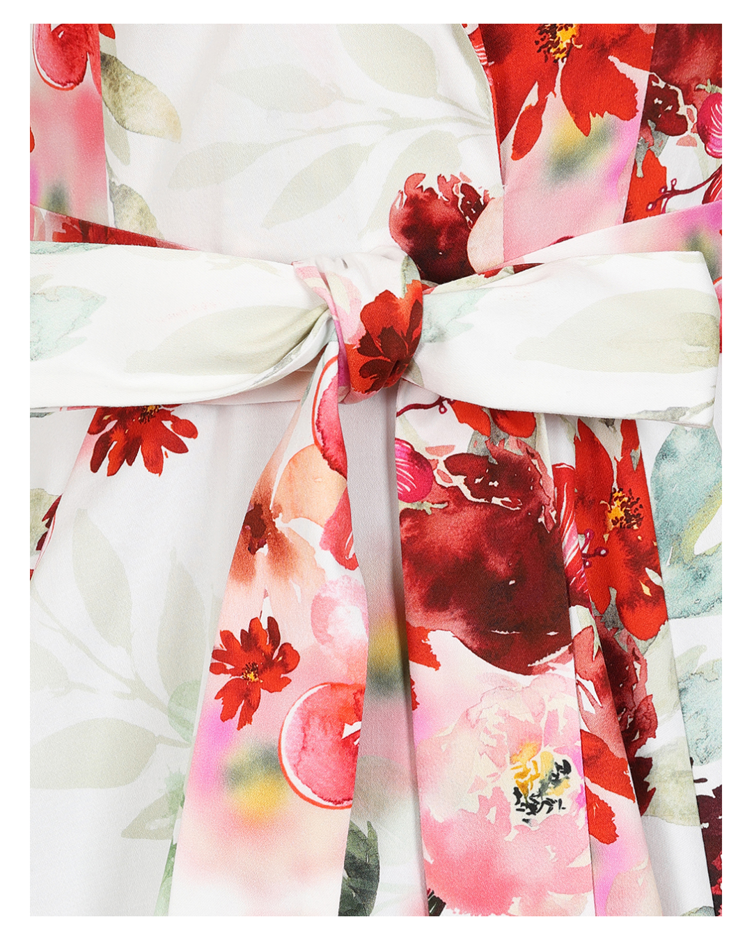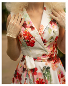 Crafted in a beautiful floral print, the Adelyn showcases a white base adorned with red and pink florals, complemented by soft beige and green leaf motifs. A perfect choice for any occasion that calls for a fresh and feminine flair.