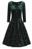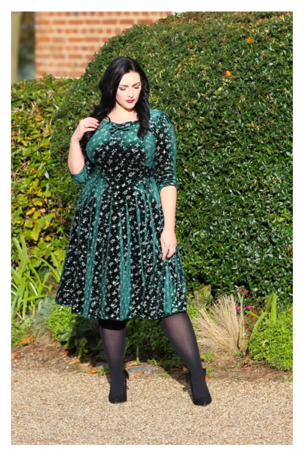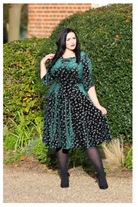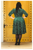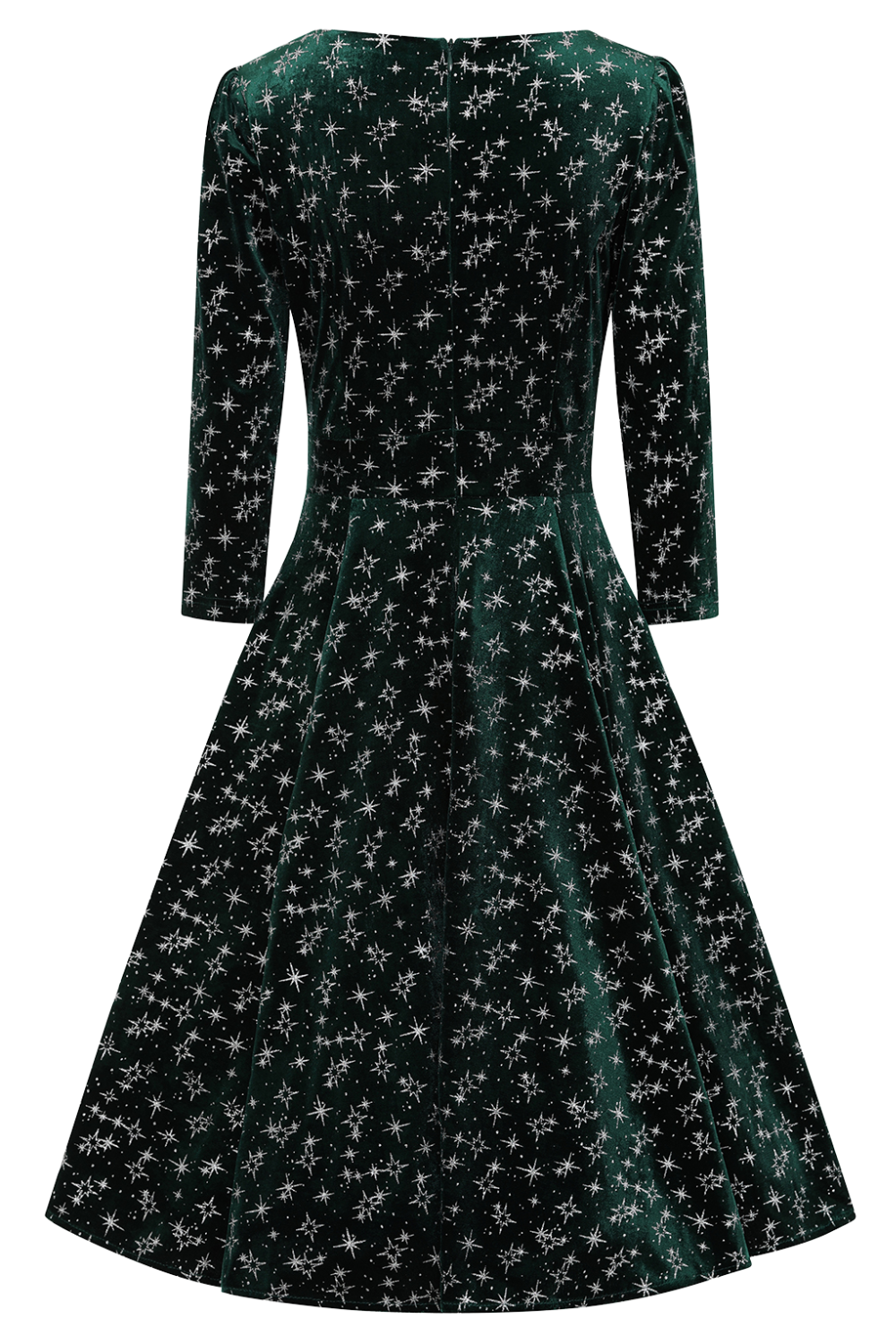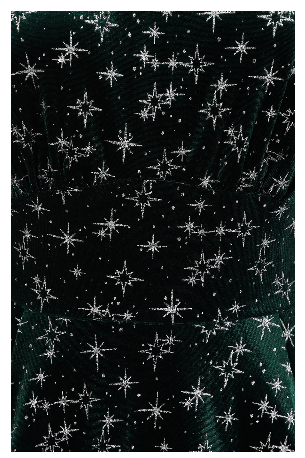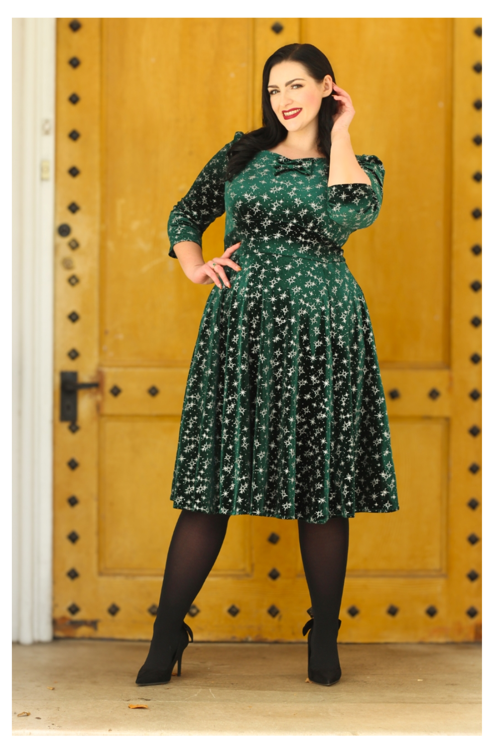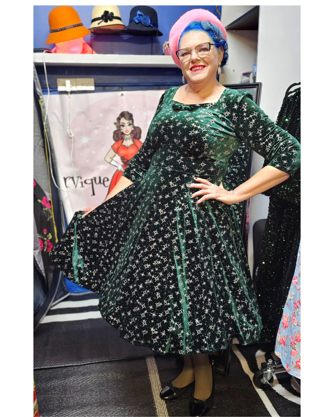 Step into the spotlight with our brand-new Paris Sparkle Swing Dress. This green velvet winter party dress is adorned with sparkly details that add a touch of glamour to your winter wardrobe. The dress boasts a flattering sweetheart neckline and a charming front bow, perfect for any festive occasion.