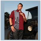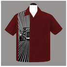 This sleek burgundy bowling shirt features a crisp hot rod print with sharp ray bursts on a sublimated panel. Perfect for a stylish evening out or a casual day at the car show.