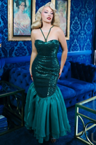The Gilded Glamour Gown — a siren-worthy showstopper drenched in rich teal green sequins, this Old Hollywood stunner captures the drama and decadence of the golden age of glamour. The Fabric color is a Deep Teal, blue/Green blend.