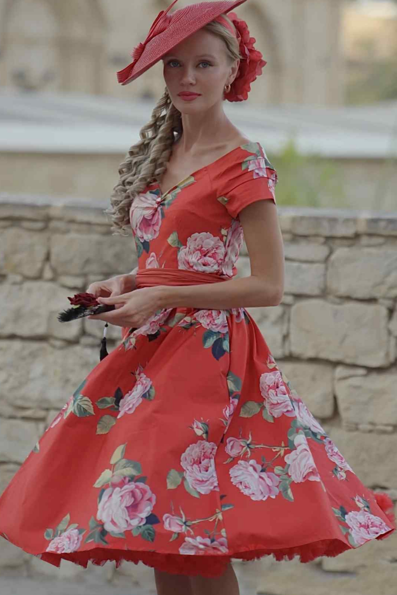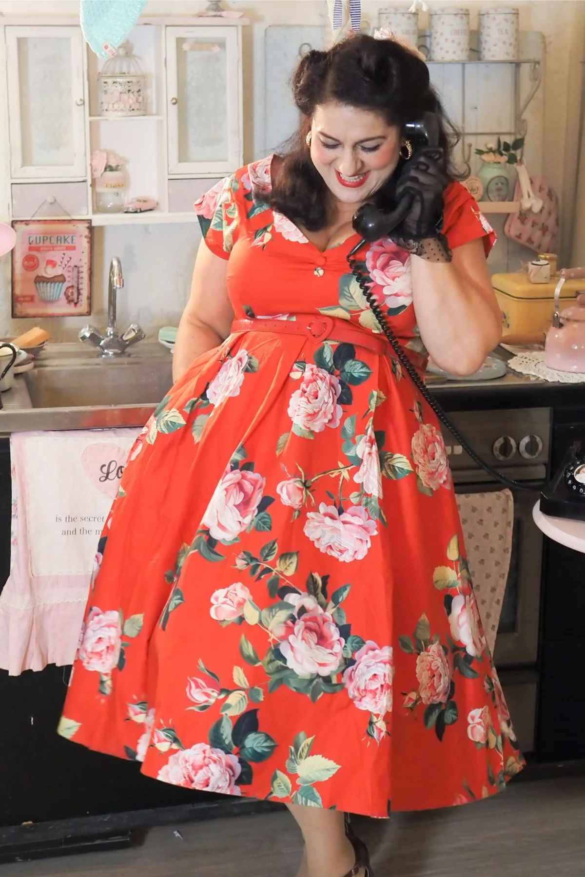 Timeless elegance meets vintage charm with this stunning scarlet rose swing dress.