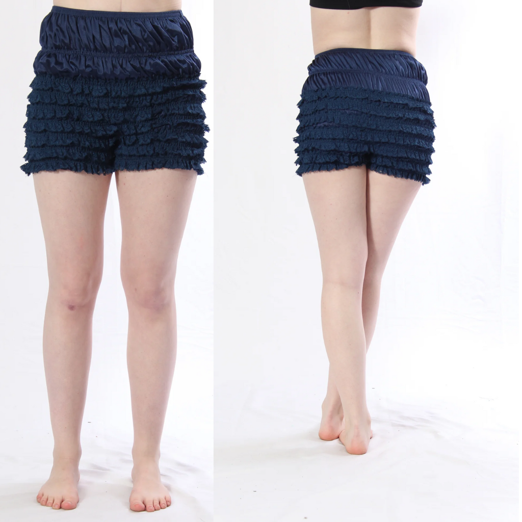 The Malco Modes hipster tanga/rumba booty short panty (model N20) is a feminine and extremely charming ruffled nylon tricot panty with shirred in rows of matching lace. These pettipants have a 5 inch inseam, are waist high, and have a lot of stretch. Although the front and back are cut the same, the hem have a charming asymmetrical tilt to it.