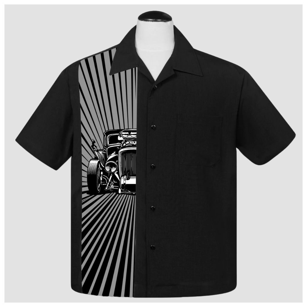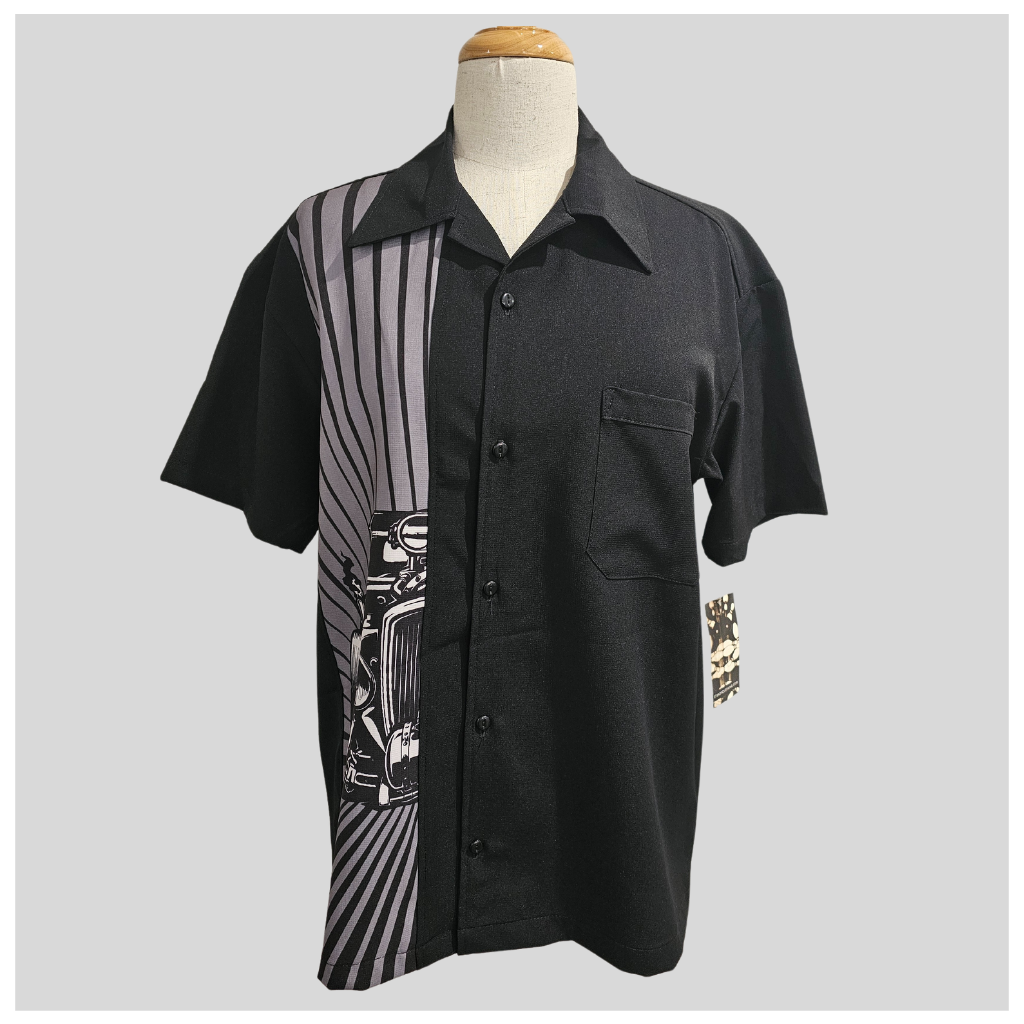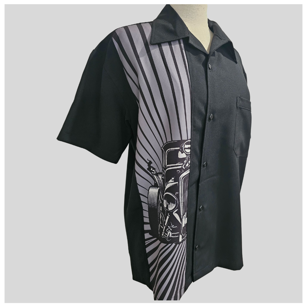 This sleek shirt features a crisp hot rod print with sharp ray bursts on a sublimated panel.  Perfect for a stylish evening out or a casual day at the car show.