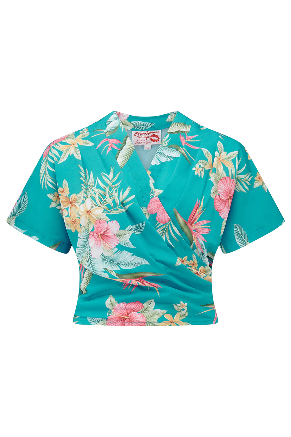 Darla Short Sleeve Wrap Blouse in Teal Honolulu 50s Tiki Style