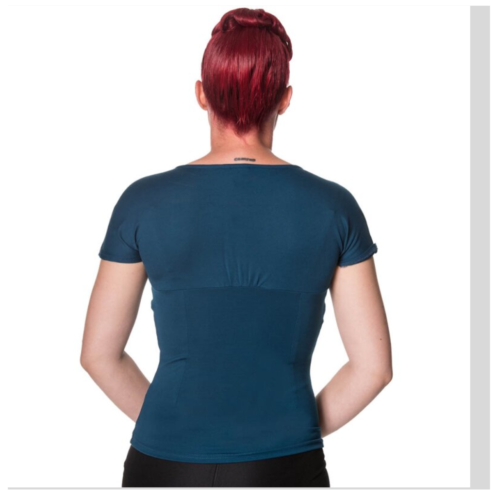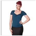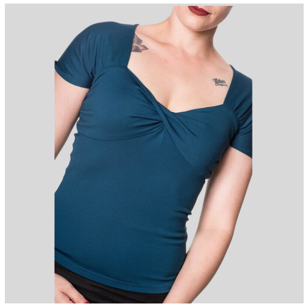She Who Dares top is the perfect top for the fashion-forward “it girl”. Crafted with timeless 50s vintage sophistication, this chic and comfortable piece features a classic twist in the midsection and a flattering sleeve, making it an essential staple for any wardrobe.