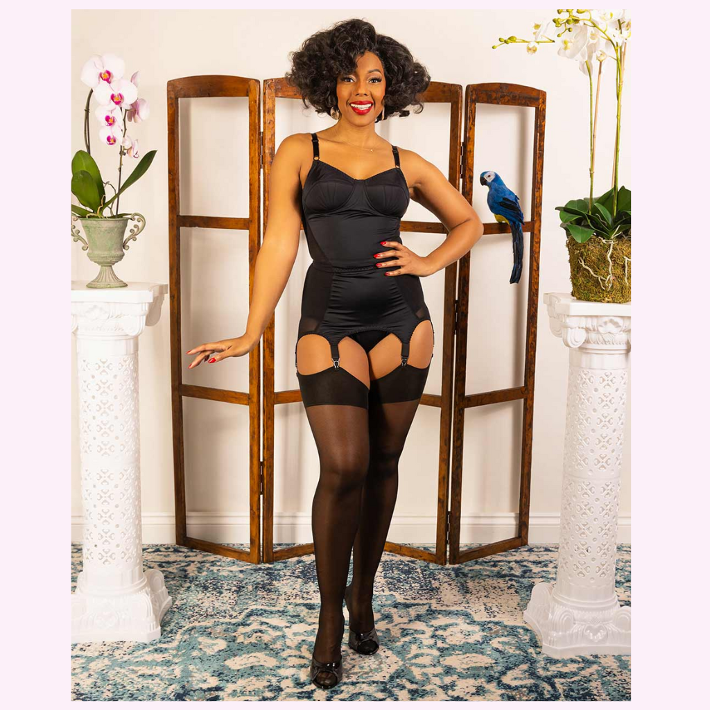 Featuring 6 adjustable metal suspender clips along with a 3 row hook and eye fastening at the back.