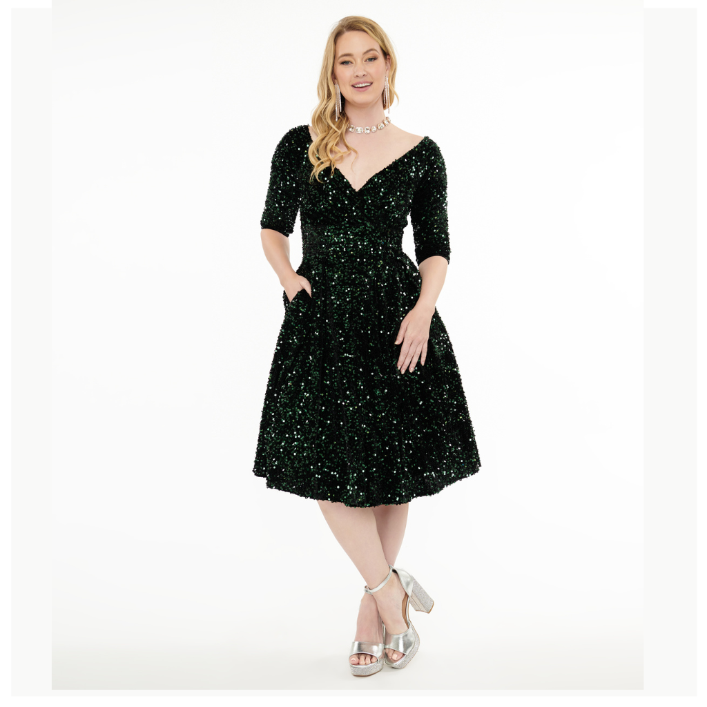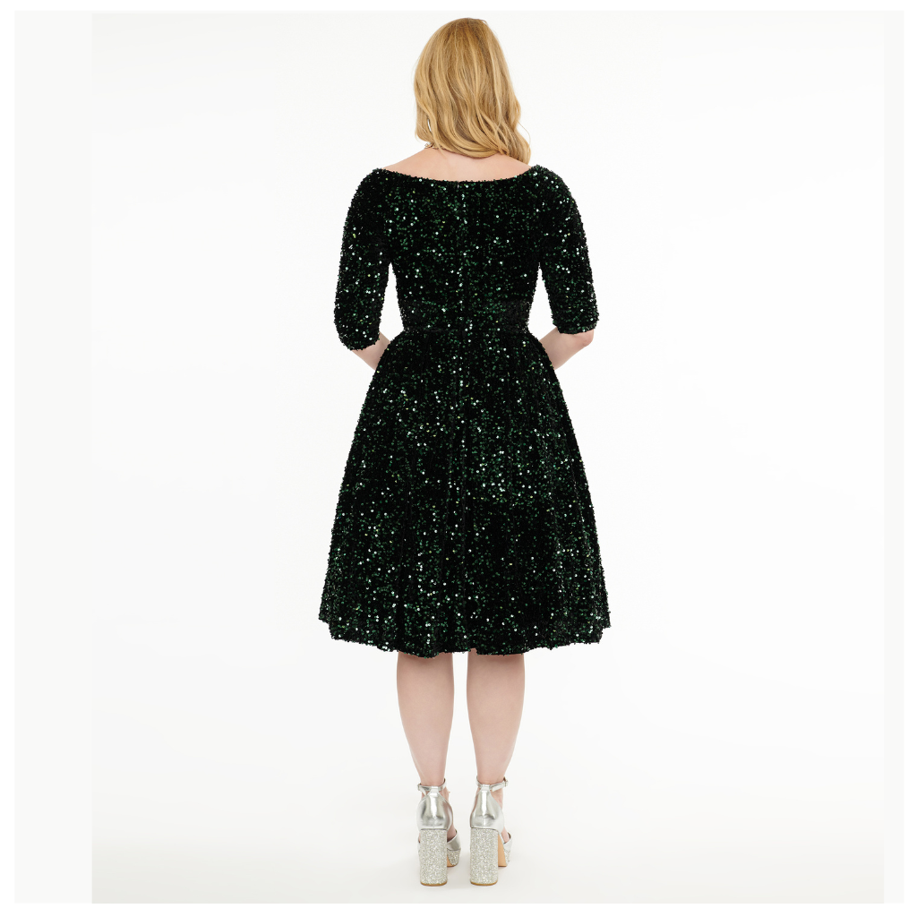 This dazzlingly 1950s dress is crafted in a fabulous green velvet that shimmers with green sequins throughout.