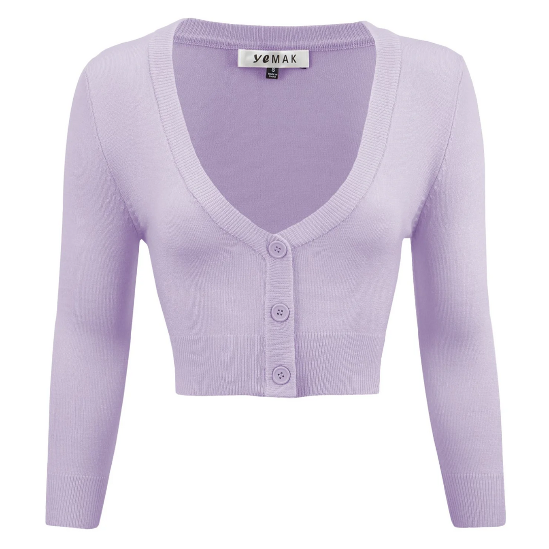 MAK Cropped Retro Style 3/4 Sleeve Cardigan - Lilac (Plus Size)