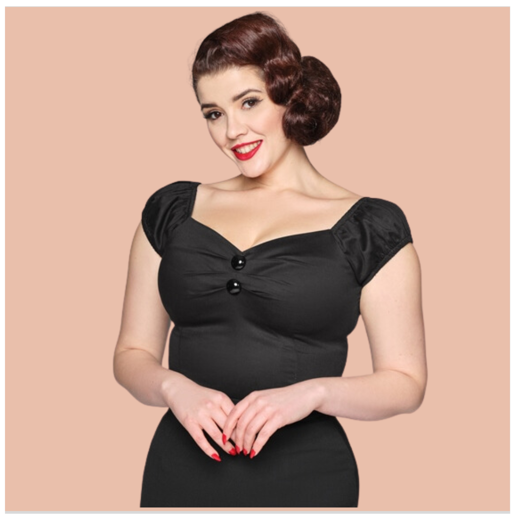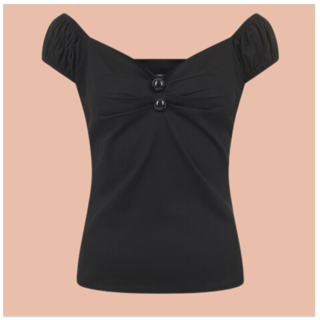 The Dolores Top Plain is one of our best-selling styles, year after year, and its no surprise why. This vintage 1950s peasant style top has elasticated puff sleeves with a classic sweetheart neckline. The top closes with a concealed zip in the side, and features pleating & large domed buttons at the bust, that flatter all shapes.