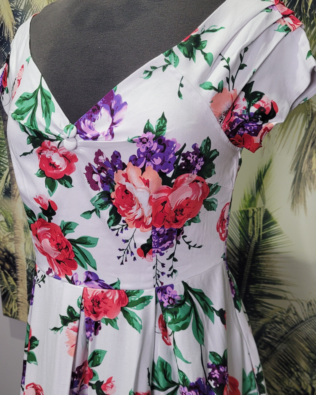 Lilly off the shoulder pleated white floral. 50s vintage style dress Size 8
