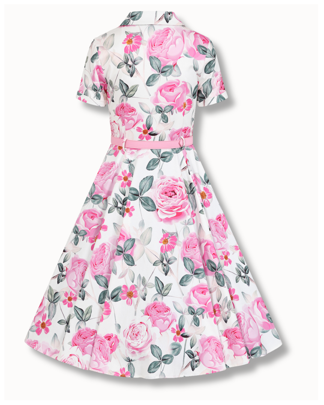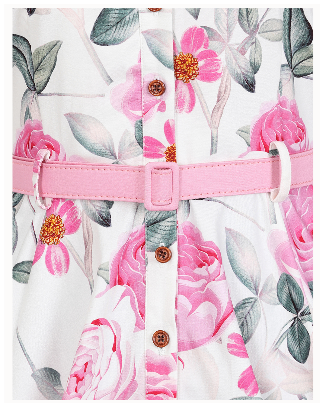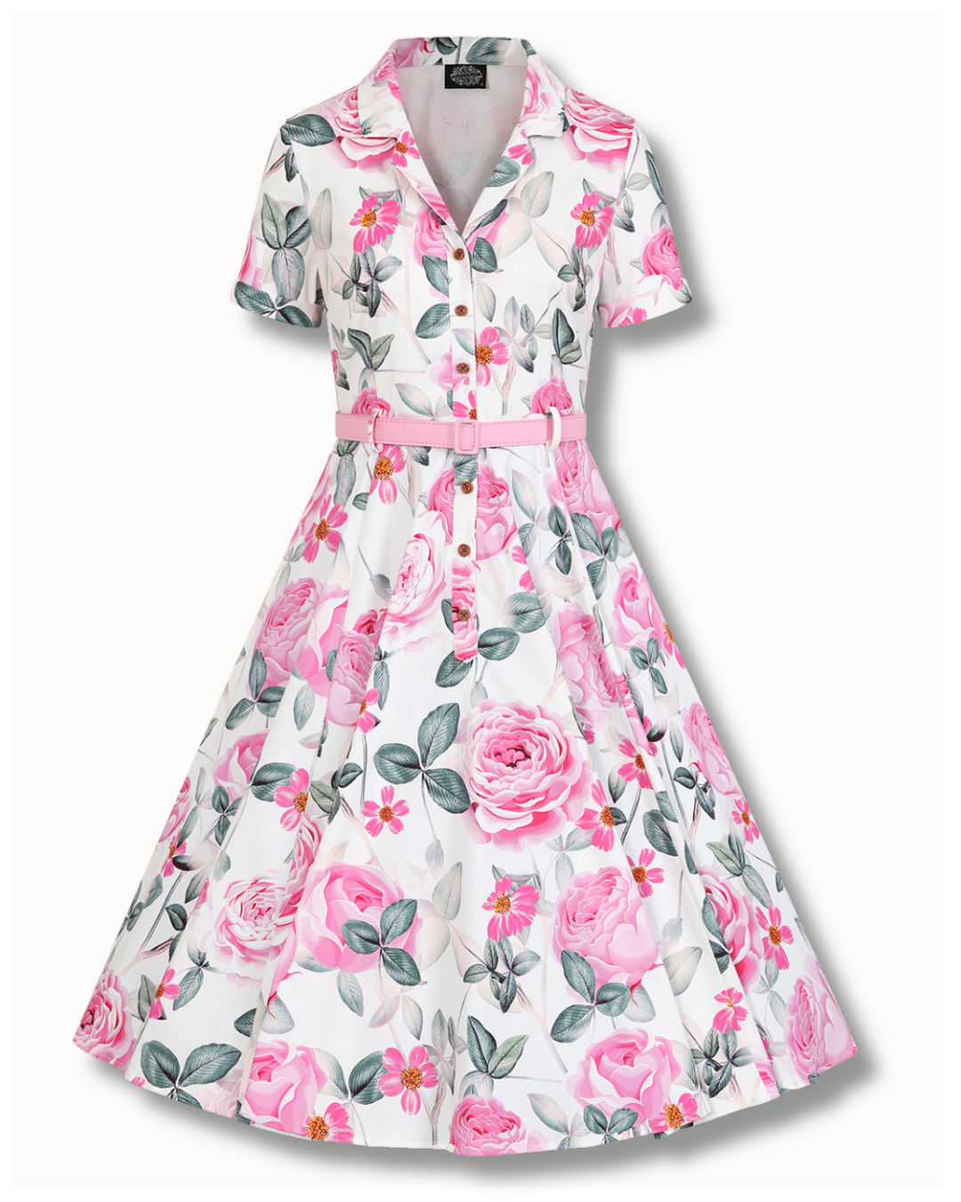 The waist is adorned with a pink belt and convenient belt loops. Thoughtfully designed with hidden side-seam pockets, this dress is as functional as it is fashionable. Perfect for sunny days, weekend brunches, or special occasions, this dress brings floral flair to any wardrobe.