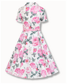 A row of front buttons runs along the button placket, enhancing its timeless appeal. Crafted on a fresh white base, this dress blooms with vibrant pink florals, lush green leaves, and artistic, painterly stems for a lively pop of color.