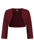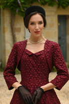 Step into timeless elegance with our vintage-inspired Thea Swing Dress with Bolero, crafted in a rich wine hue and adorned with an exquisite embossed floral print.