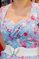 Made from premium quality 97% cotton for comfort and 3% Spandex for that little extra stretch, the blue vintage floral print Sheridan Kate rock and roll dress features lined top, low sweet heart neckline, full back coverage, concealed zipper, small cap sleeve and concealed pockets.