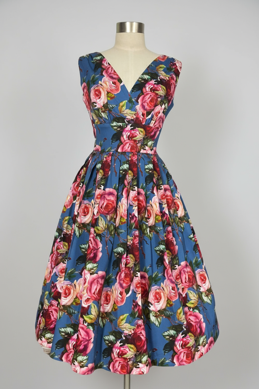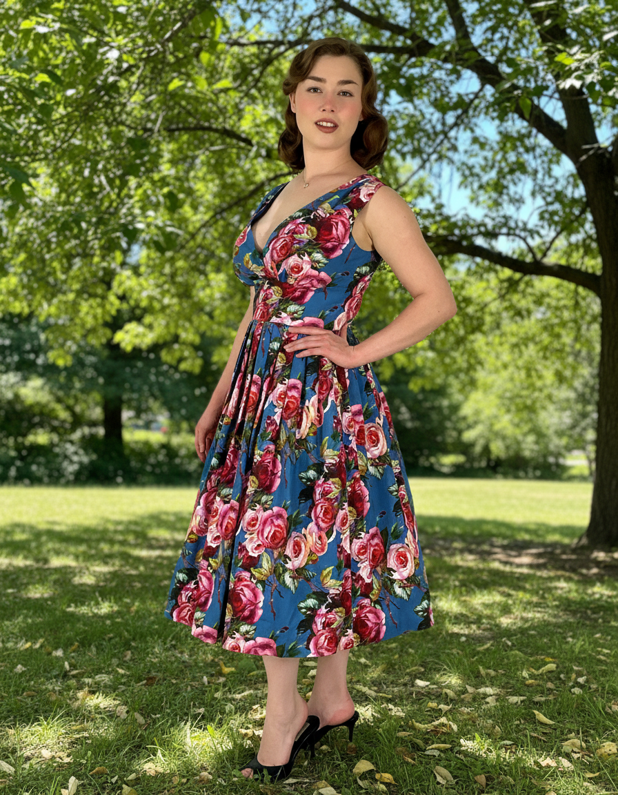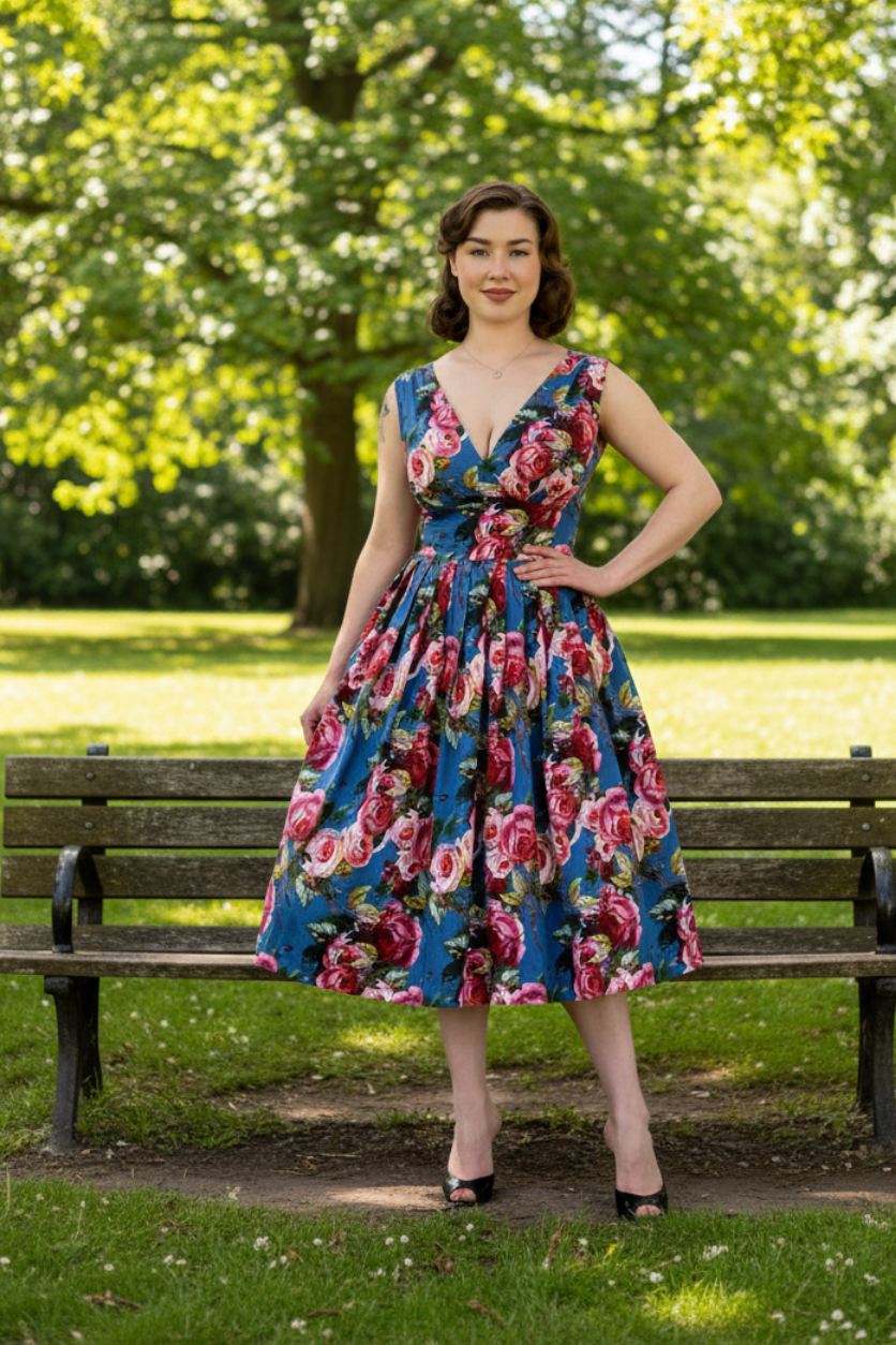 Inspired by the silhouettes of the 1950s , the Vivian Features a flattering crossover bodice that combines classic vintage elegance with everyday practicality. The rose garden print in stretch cotton Sateen blooms across the fabric, bringing a touch of romance to your look, while the flattering fit-and-flare shape creates timeless pin-up charm.